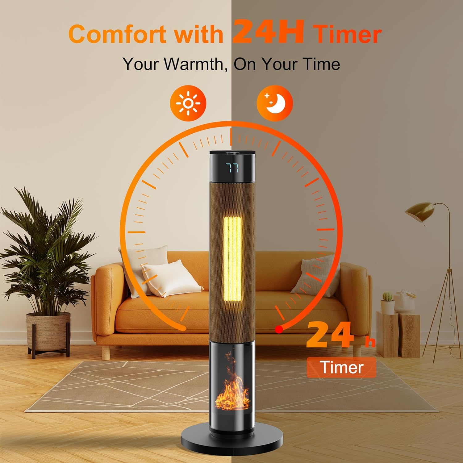- Morning: Timer activates heater automatically 30 minutes before alarm