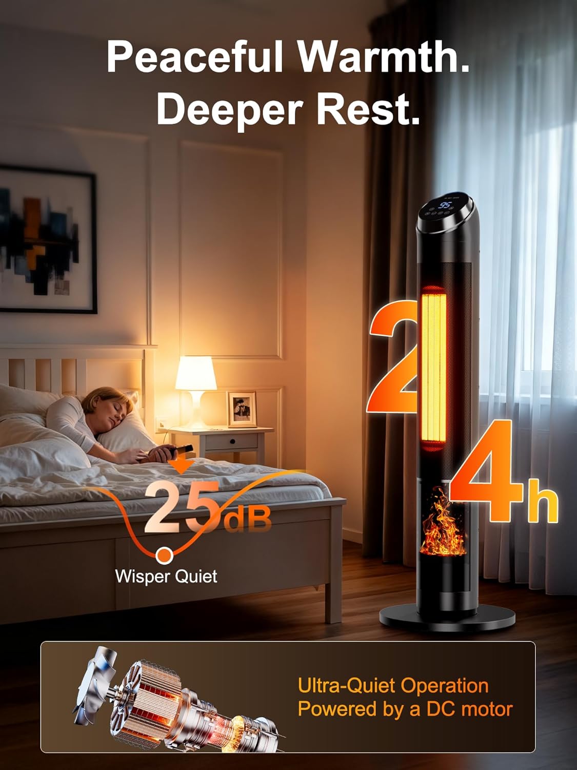 At just 25 decibels, this indoor heater operates quieter than a whisper. For context, that’s softer than a library and barely audible from five feet away. The DC motor runs so smoothly that I’ve occasionally checked to confirm it’s actually running.