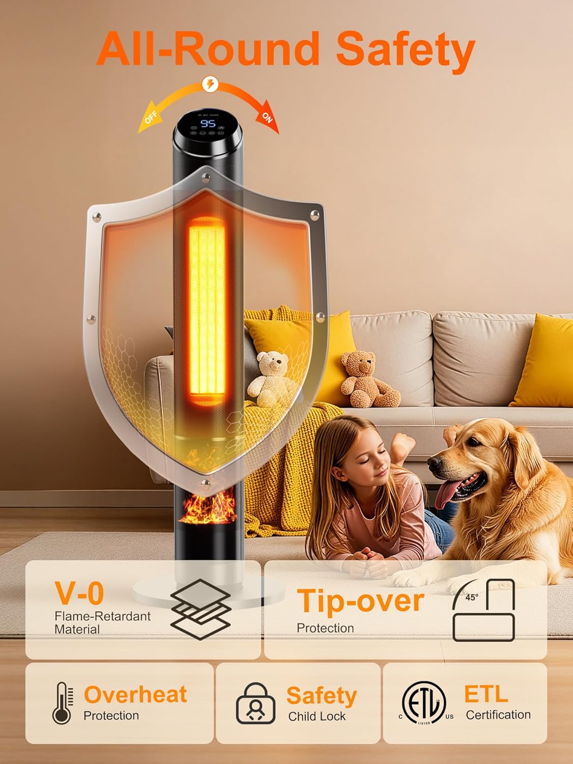Tip-Over Switch: The instant shutoff activates immediately if the heater tilts beyond safe angles. My dog’s tail knocked it over during an enthusiastic greeting (she’s a Great Dane, so chaos happens). The Uthfy shut off before hitting the floor. No sparks, no continued heating, no danger.